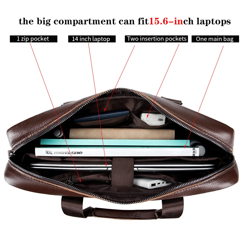 This briefcase showcases the superior quality of genuine cowhide leather, known for its exceptional durability and natural character. The leather undergoes a refined tanning process that preserves its natural grain while enhancing its resistance to daily wear. Premium metal hardware, including smooth-operating zippers and sturdy clasps, complements the leather perfectly while ensuring long-term functionality. The precision stitching and carefully finished edges speak to the quality craftsmanship, while the leather’s natural ability to develop a rich patina means your briefcase will become more distinguished with age, telling the story of your professional journey.