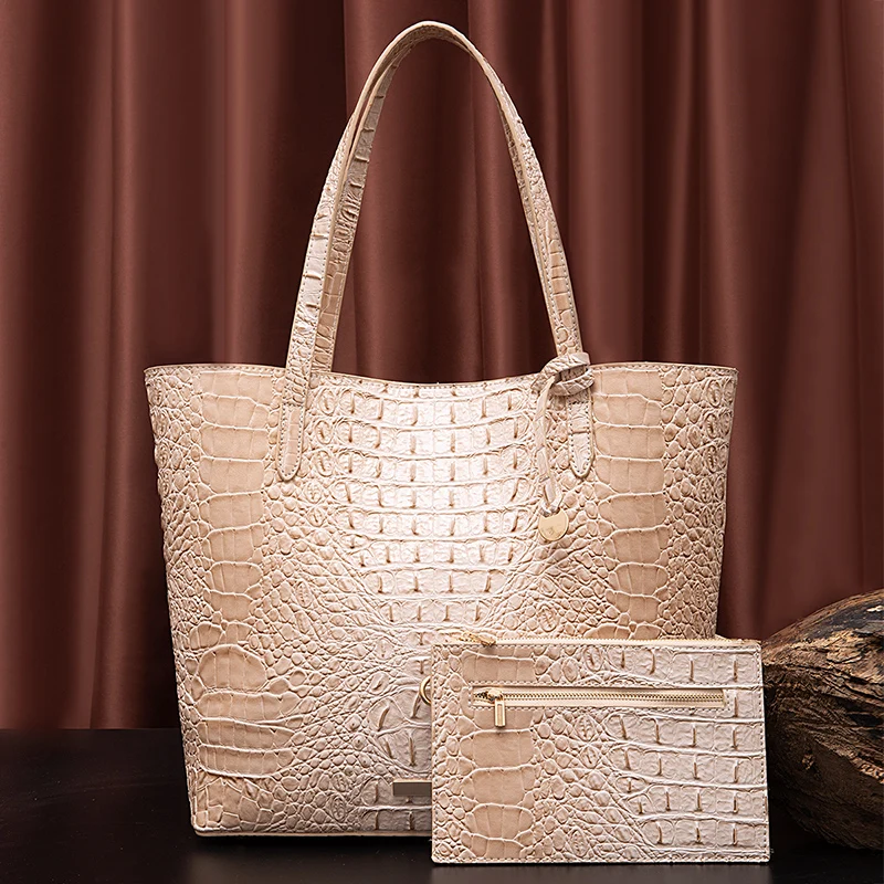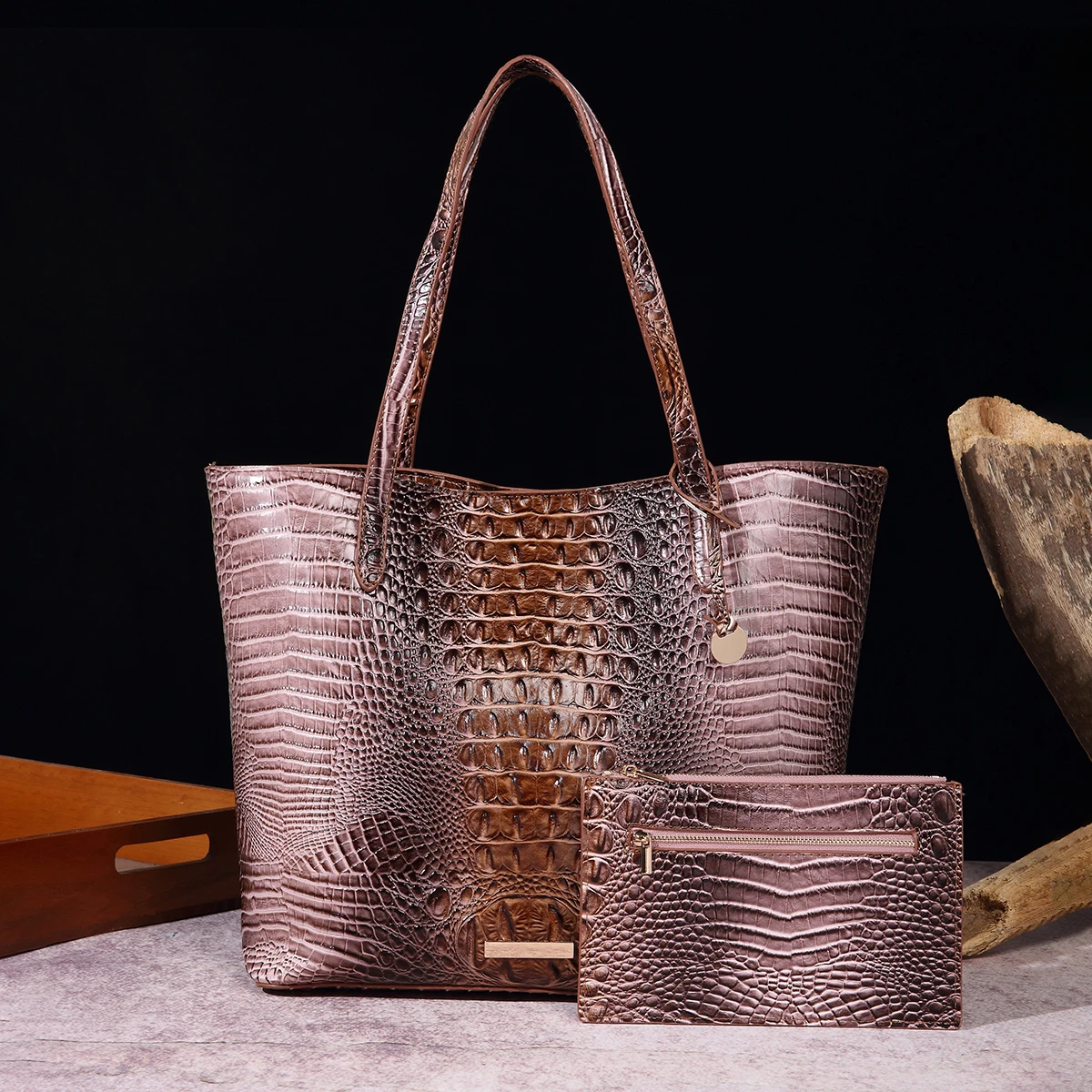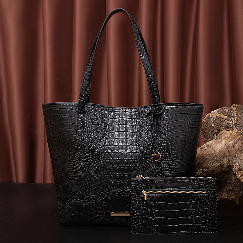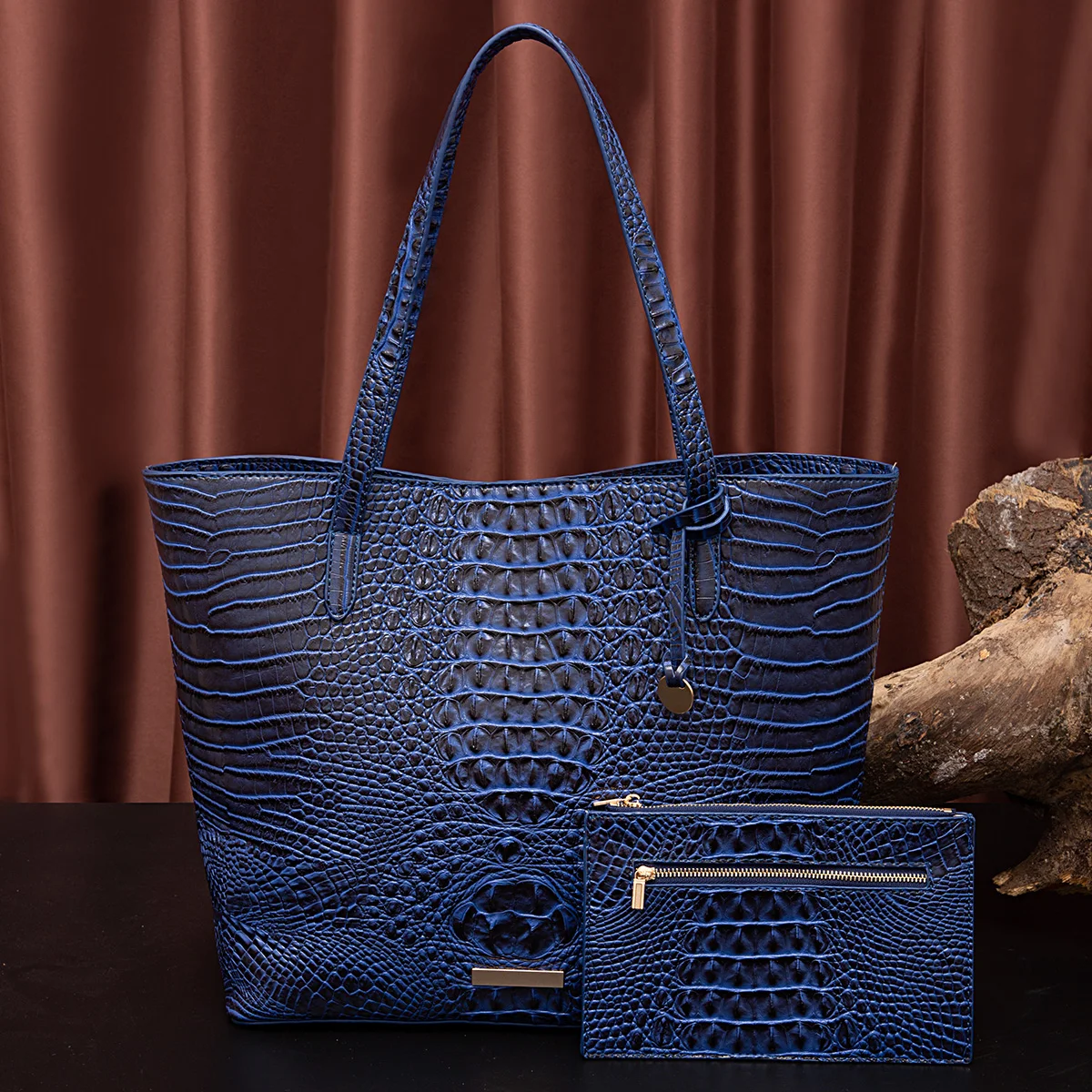 Elegant crocodile pattern tote suits any professional setting. Two-piece set offers flexible use. Carry it for work, meetings, or travel.