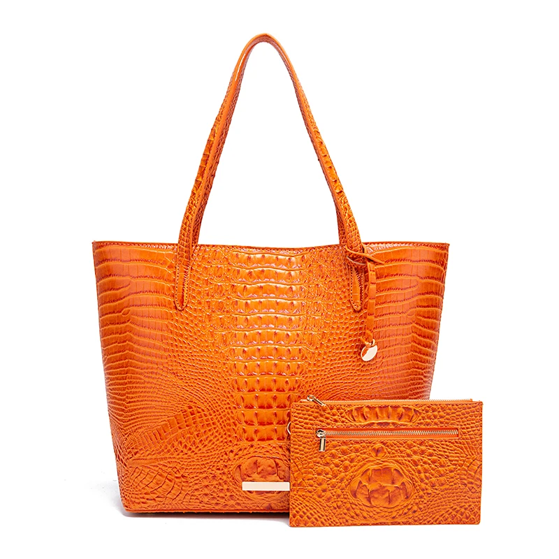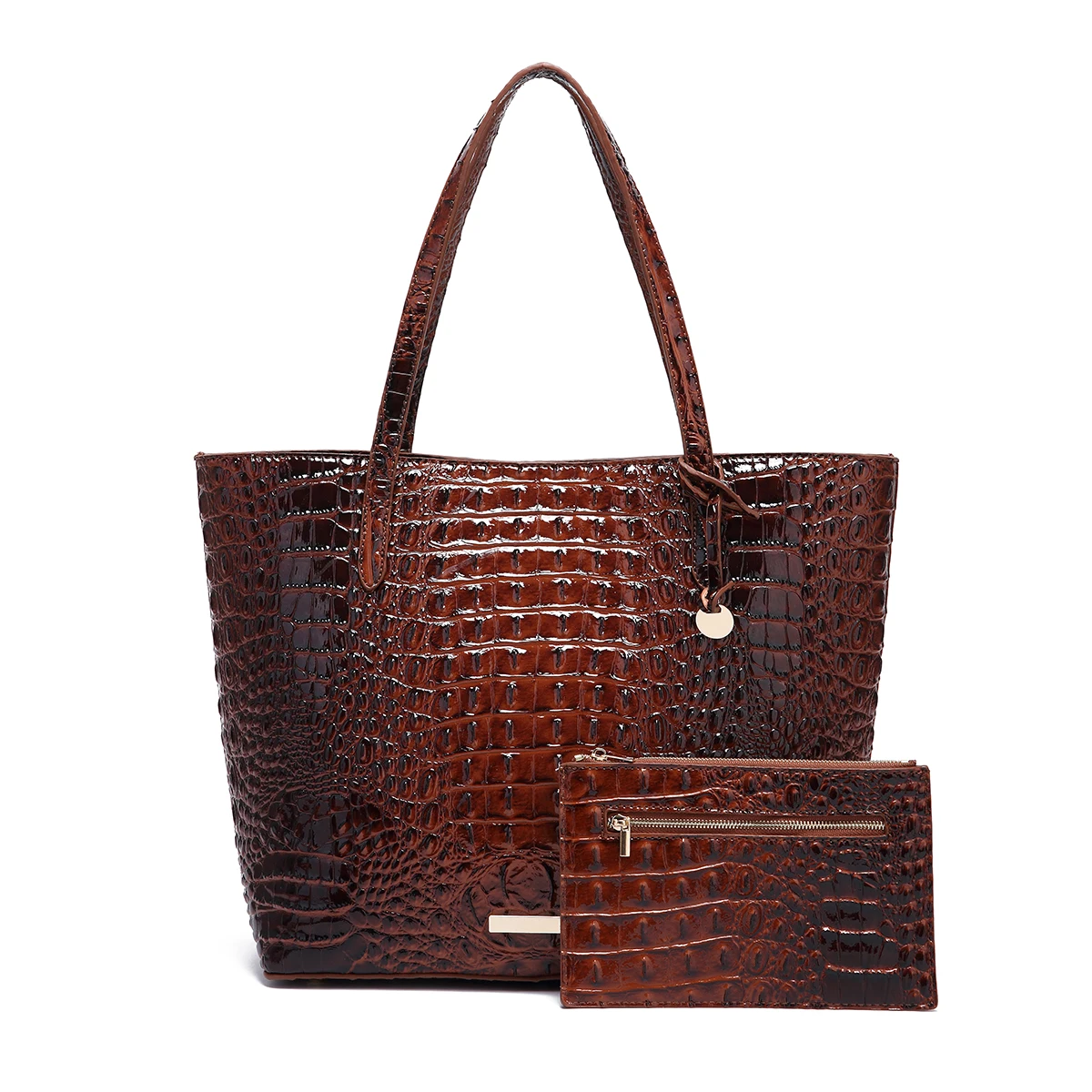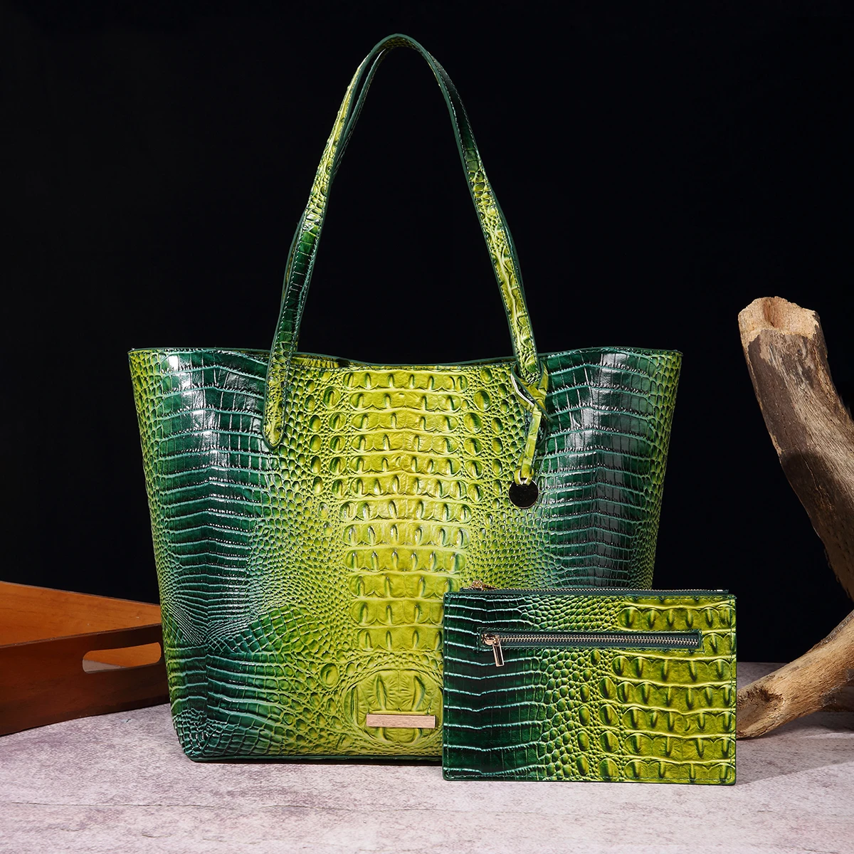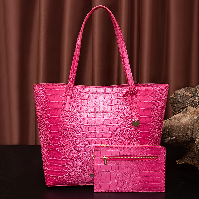 Elegant crocodile pattern tote suits any professional setting. Two-piece set offers flexible use. Carry it for work, meetings, or travel.