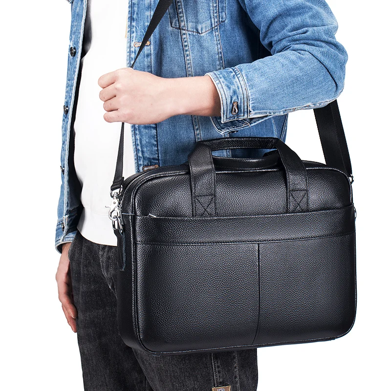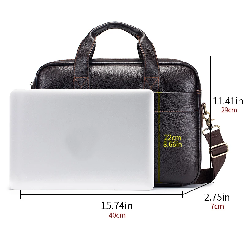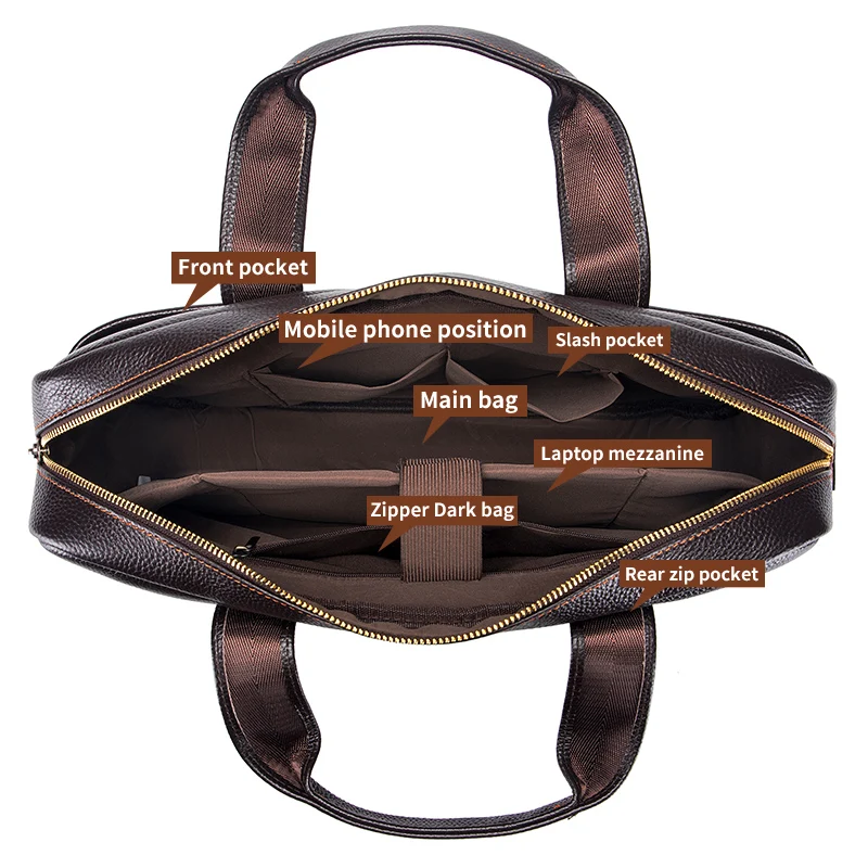 This briefcase is crafted from top-layer full grain cowhide leather, known for its exceptional durability and natural character. The premium leather undergoes a meticulous tanning process that preserves its natural grain pattern while enhancing its resistance to daily wear. High-quality metal zippers and hardware ensure smooth operation and long-lasting performance, while precise stitching reinforces stress points for maximum durability. The rich texture of genuine cowhide develops a unique patina over time, growing more distinguished with use while maintaining its professional appearance throughout years of service.