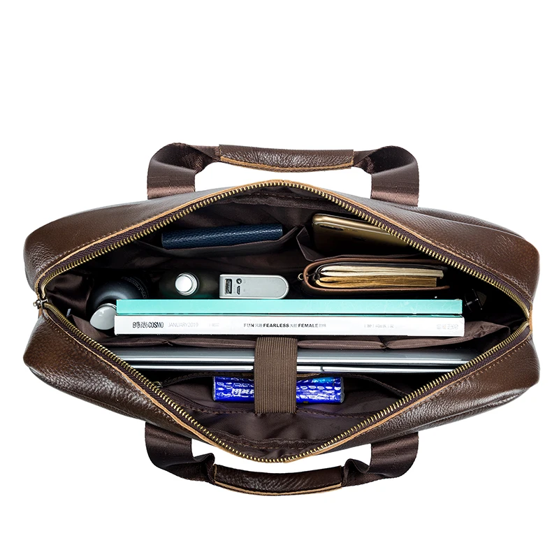 This briefcase is crafted from full-grain cowhide leather, the highest quality grade that maintains the natural surface characteristics of the hide for superior strength and character. The natural grain creates a distinctive appearance that develops a rich patina over time, becoming more beautiful with each use. Premium metal zippers and hardware ensure smooth operation even after years of daily use, while reinforced stitching at stress points provides exceptional durability. The quality craftsmanship is evident in every detail, from the precisely finished edges to the sturdy construction that will maintain its professional appearance for years.