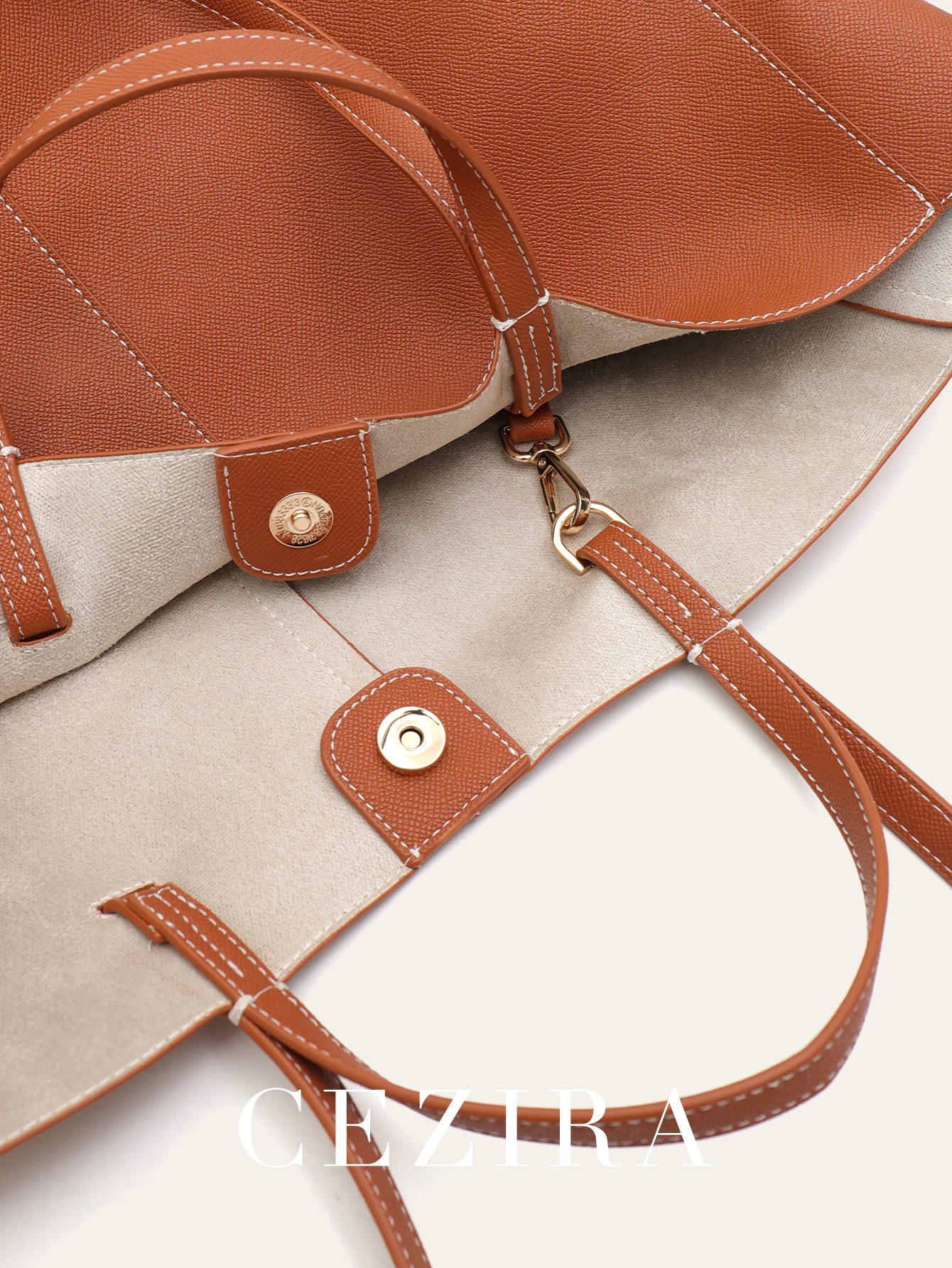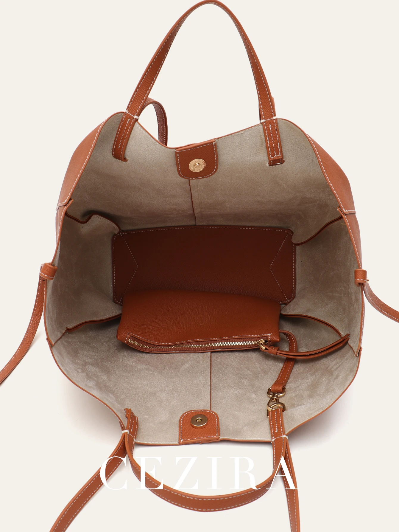The spacious main compartment offers generous capacity for all your daily essentials, from documents to personal items. This tote’s trapeze shape creates a wider bottom that allows the bag to stand upright on its own, keeping your belongings accessible and organized. The soft interior provides a gentle environment for your valuables.